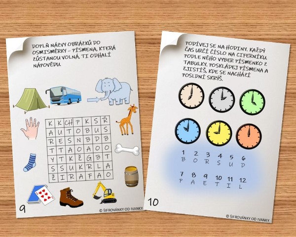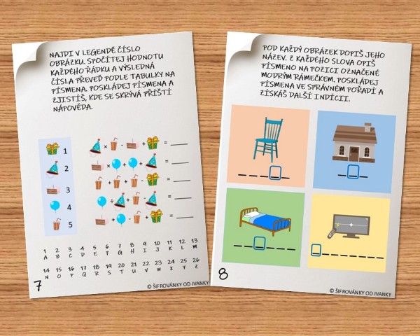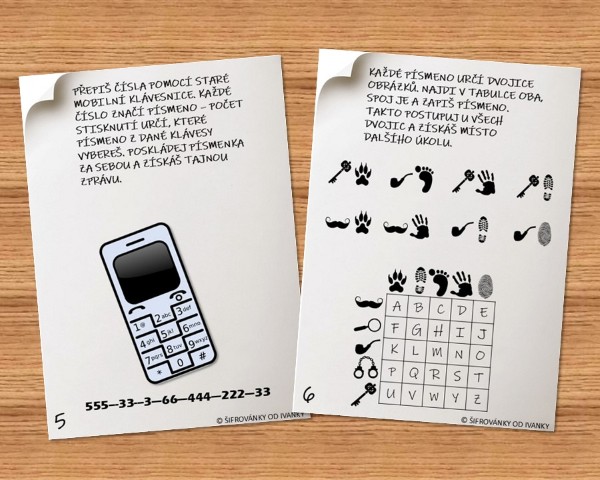 - 10 karet s šifrou – každá karta odhaluje novou stopu